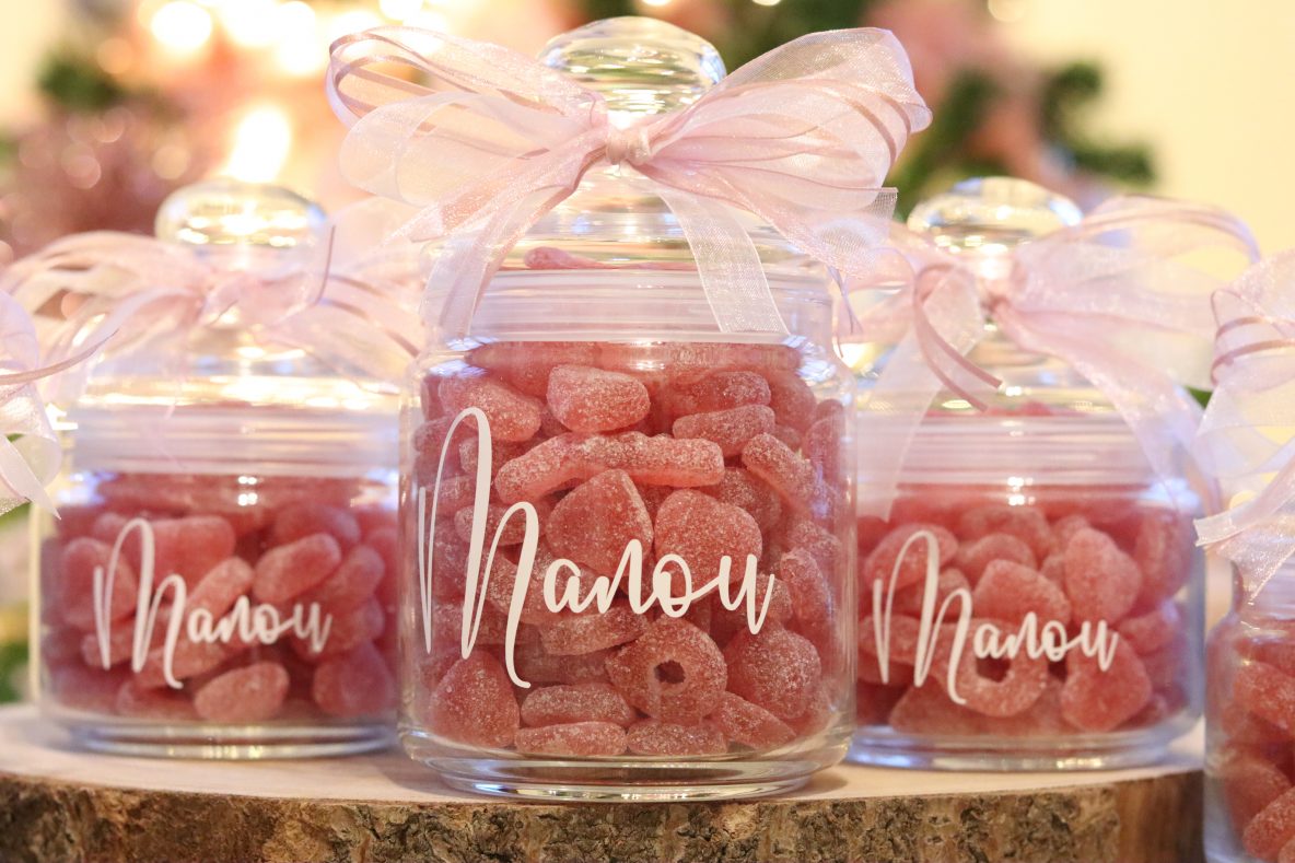 Onze klanten gebruiken onze tool om glazen potjes te voorzien van unieke stickers. De grote stickers (tot 10 cm x 10 cm) zijn ideaal voor doopsuiker of andere geschenken. Met de tool kun je volledig vrij ontwerpen, zodat je een resultaat krijgt dat helemaal bij jouw feeststijl past.