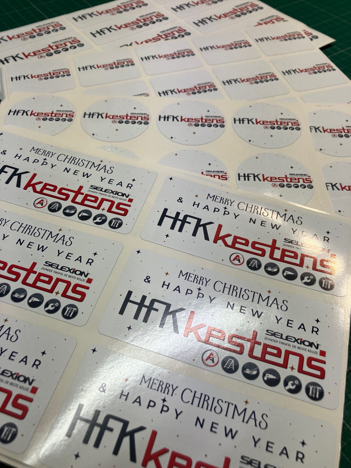 Voor HFK Kestens maakten we stickers met hun bedrijfslogo én stickers met de boodschap “Fijne Feesten”. Deze werden gebruikt om eindejaarspakjes persoonlijk en professioneel af te werken. Eindejaarsstickers met logo zijn een eenvoudige manier om klanten te bedanken en tegelijk je merk zichtbaar te houden.