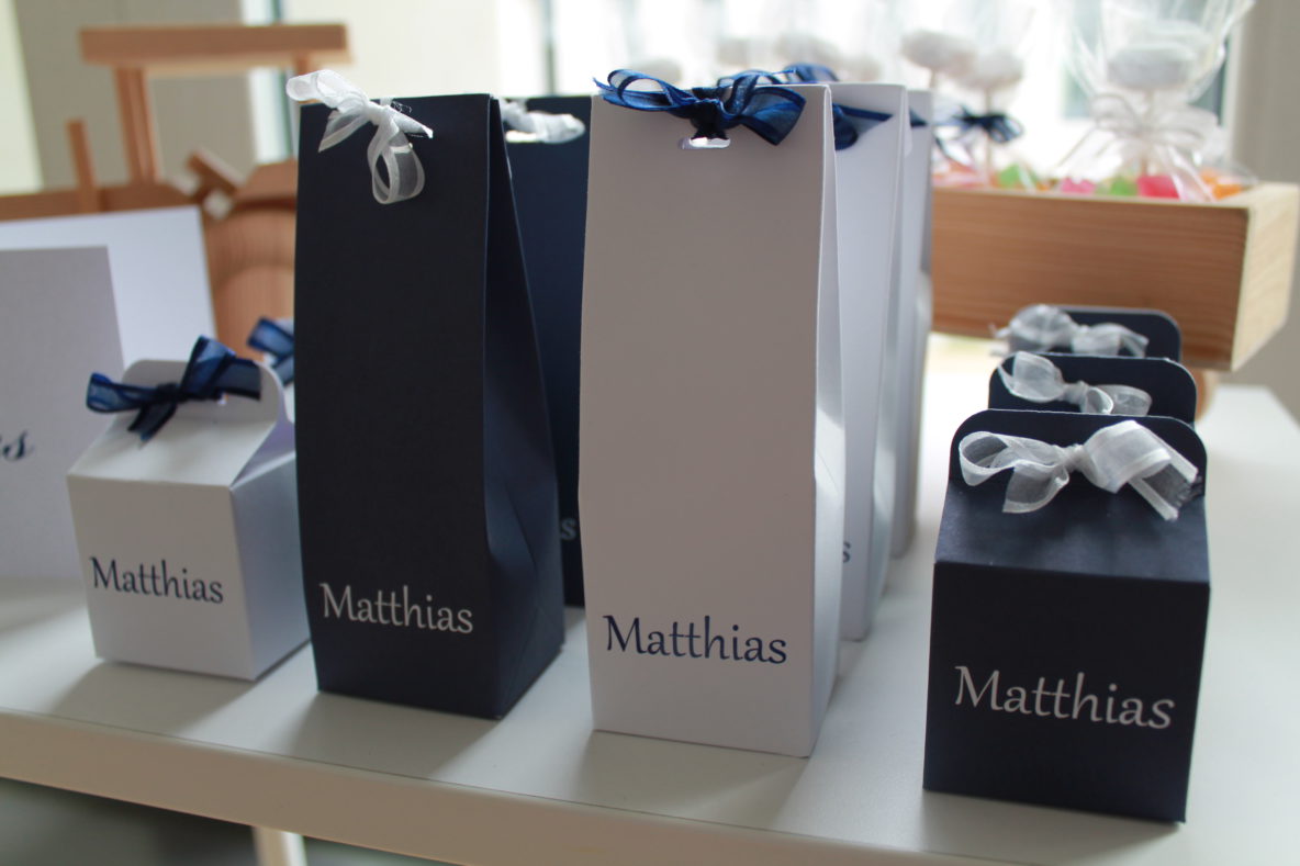Stijlvolle doopsuiker kan je gerust zelf maken! Koop een paar simpele doosjes, vul ze met suikerbonen. Sluit ze met een mooi strikje en plak onze naamstickers erop.