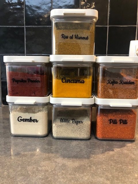 Een opgeruimde keuken begint bij overzicht. Dat bewijst deze realisatie van een klant die zijn kruidenpotjes voorzag van transparante labels, volledig zelf ontworpen via de website van De Stikkie Shop.